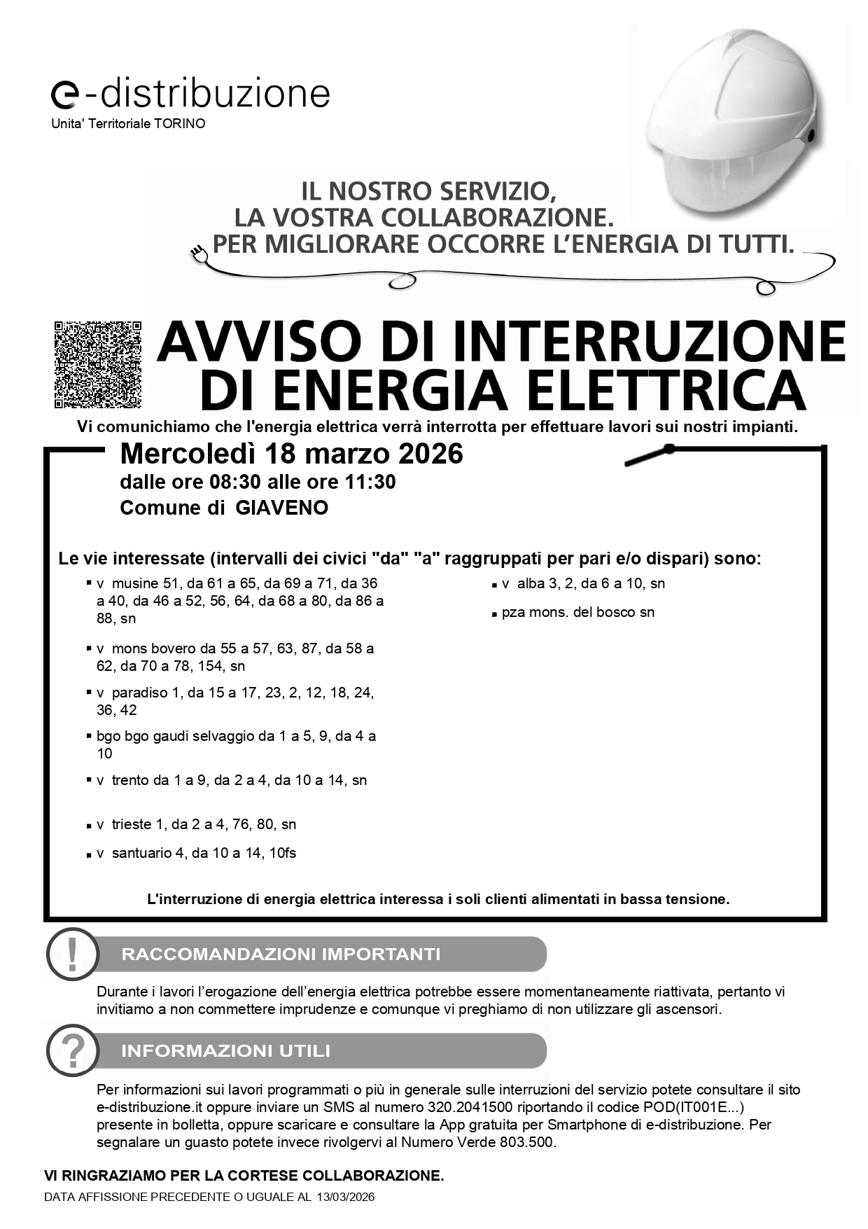 Enel comunica che per eseguire dei lavori sulla rete sarà necessario interrompere l'erogazione di energia elettrica