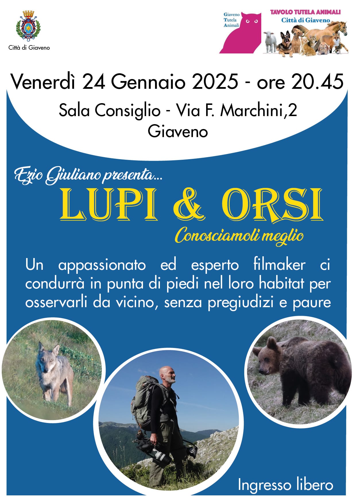 Serata pubblica in compagnia di Ezio Giuliano, appassionato filmaker, che accompagnerà a conoscere da vicino come vivono lupi e orsi nel loro habitat naturale.