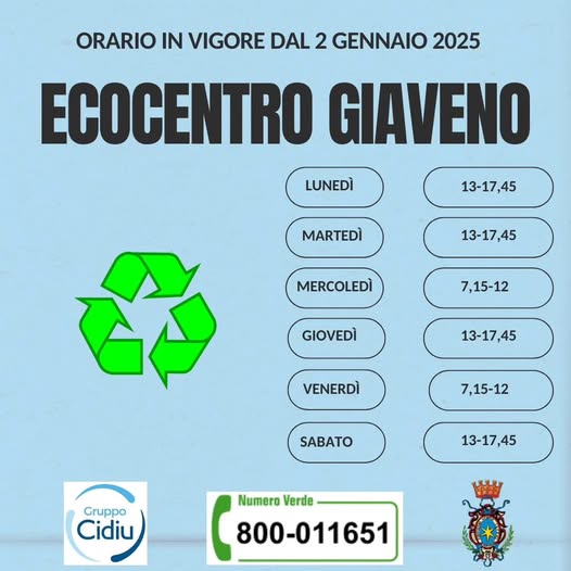 Sarà in vigore dal 2 gennaio 2025 il nuovo orario dell’Ecocentro in Piazzale Don Calzolari.