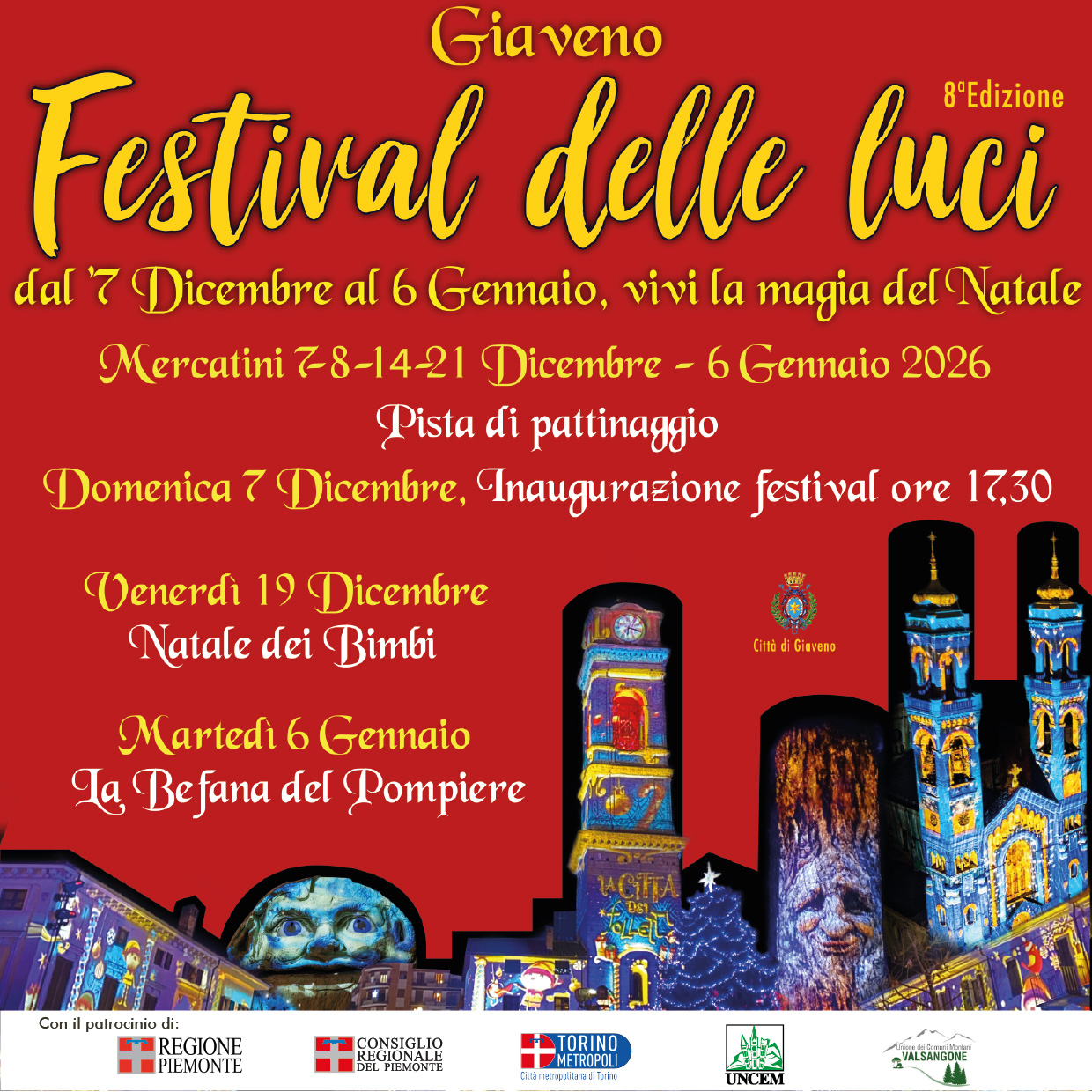 Giaveno torna a illuminarsi con il Festival delle Luci 2025, un mese di magia, colori e tradizioni che dal 7 dicembre 2025 al 6 gennaio 2026 accompagnerà cittadini e visitatori in un’atmosfera unica dedicata alla bellezza del Natale.