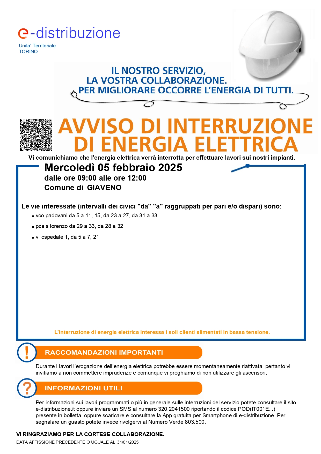 Enel comunica che per eseguire dei lavori sulla rete è necessario interrompere l'erogazione di energia elettrica