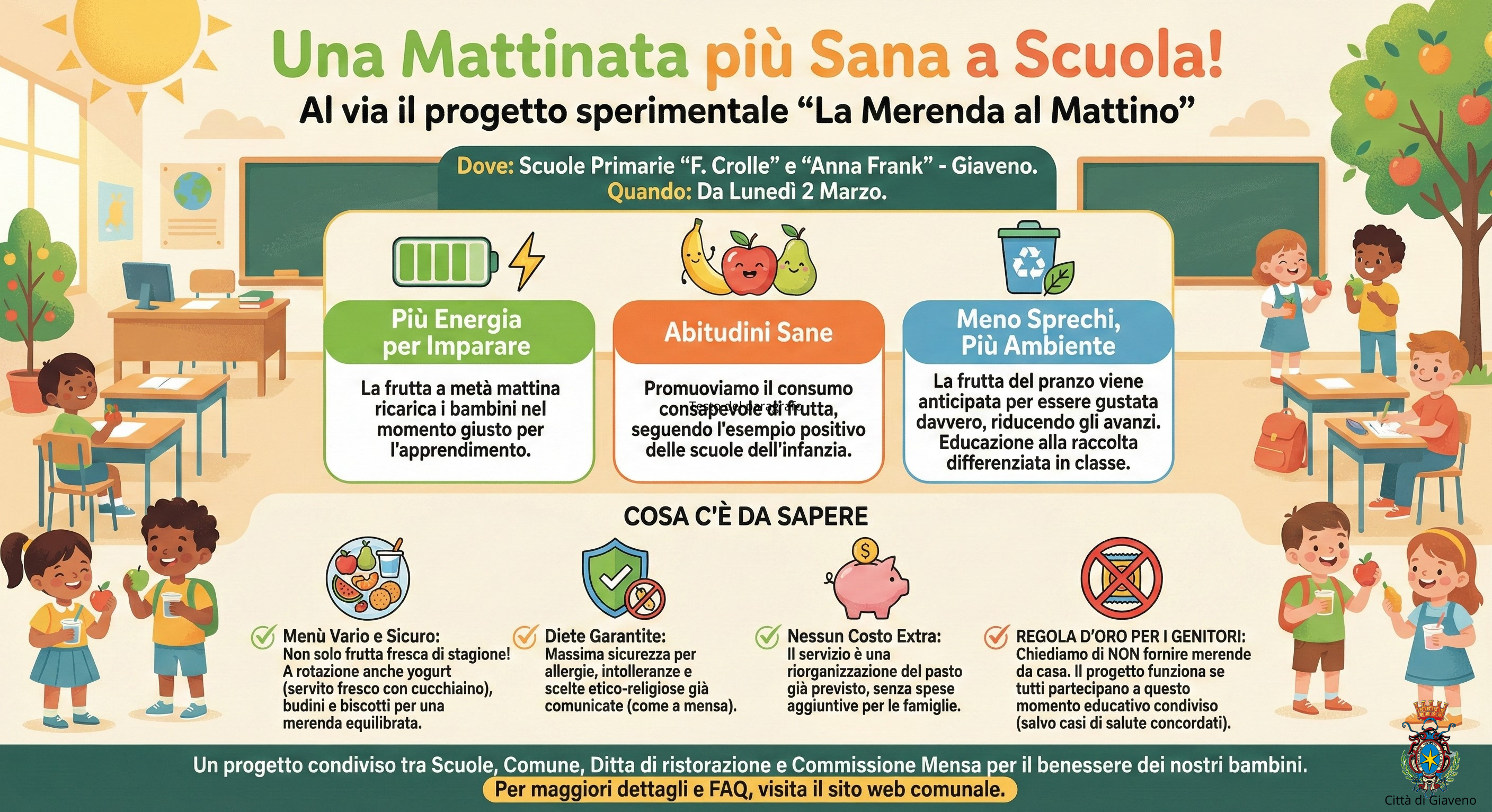 A partire dal 2 marzo 2026, il Comune di Giaveno avvia in via sperimentale il progetto “La merenda al mattino” presso le scuole "pilota" primarie Ferruccio Crolle e Anna Frank, con l’obiettivo di promuovere sane abitudini alimentari e incentivare il consumo di frutta tra gli alunni.