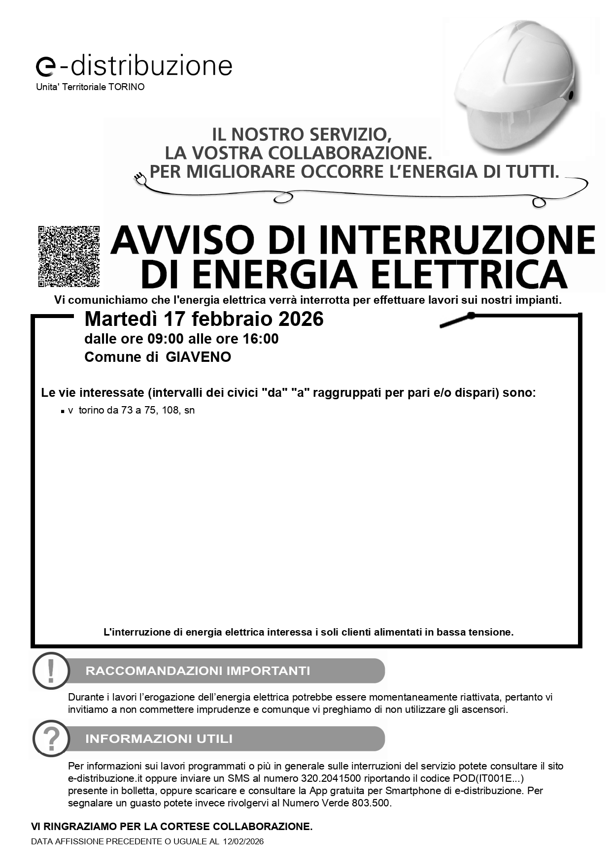 Enel comunica che per eseguire dei lavori sulla rete è necessario interrompere l'erogazione di energia elettrica