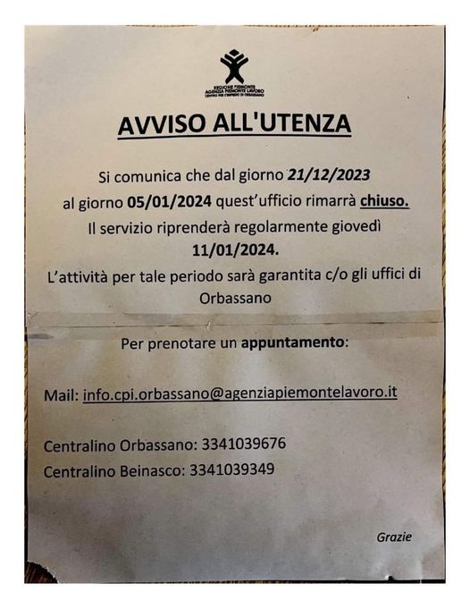 Mail: info.cpi.orbassano@agenziapiemontelavoro.it