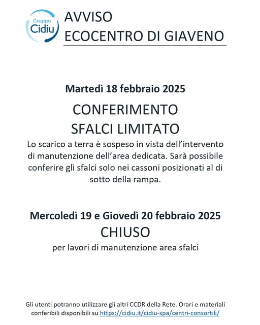 Si informano i gentili utilizzatori dell’Ecocentro di Giaveno che, a causa di lavori di manutenzione dell’area dedicata alla raccolta sfalci, nelle seguenti giornate della prossima settimana il centro sarà chiuso o non pienamente operativo